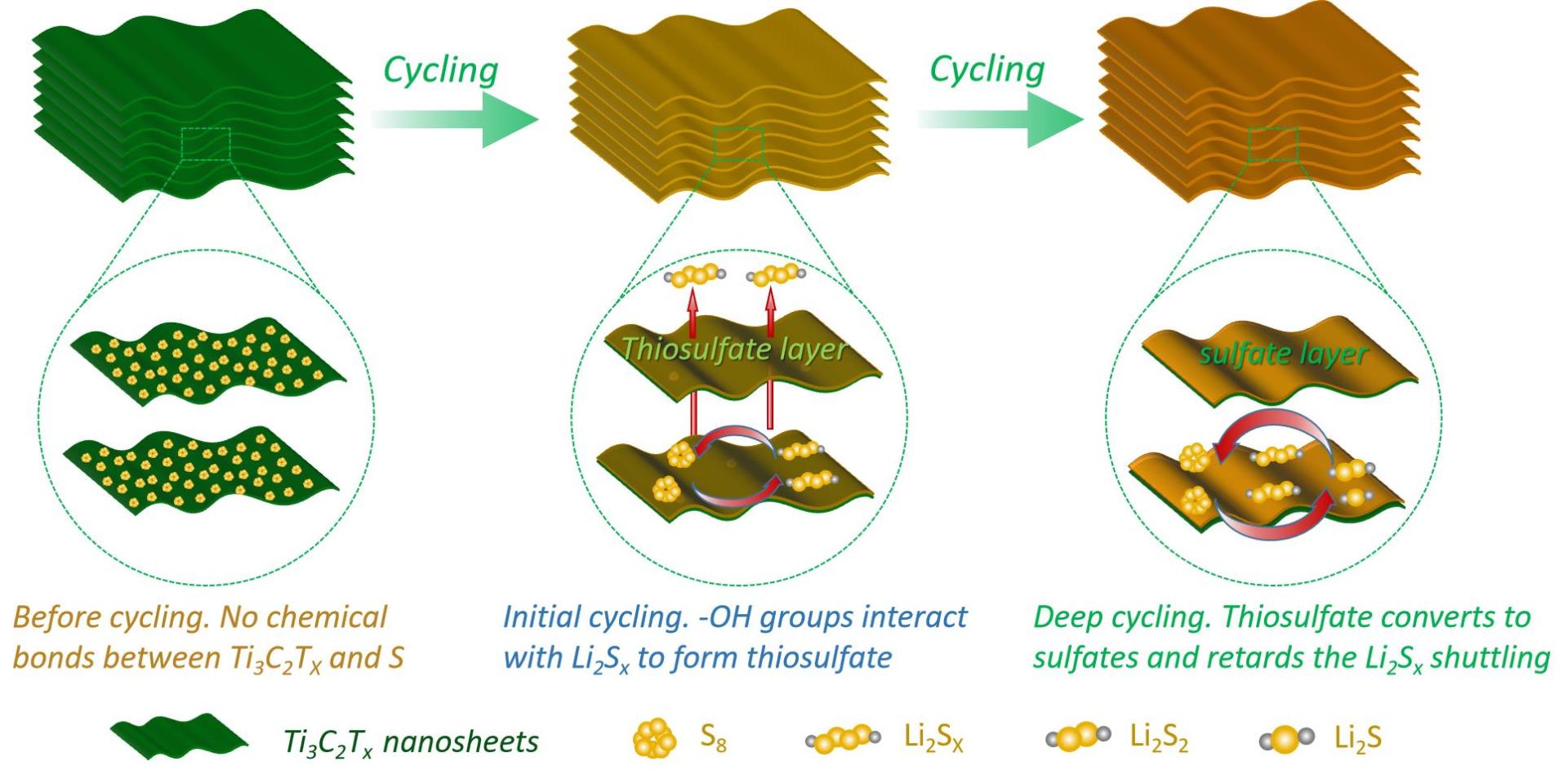图4. Ti3C2Tx表面原位形成硫酸盐复合保护膜捕集多硫化锂的示意图