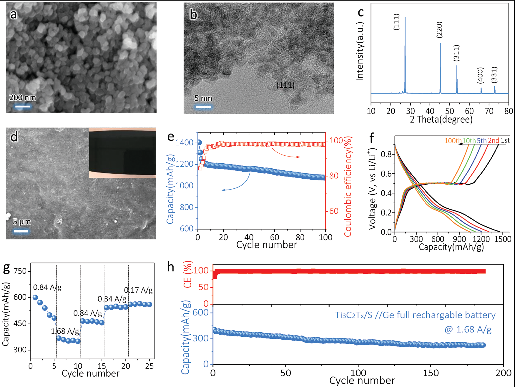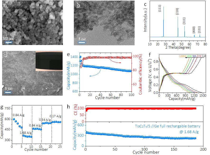 图6. 基于Ti3C2Tx/S导电纸的Ge-S全电池原型器件