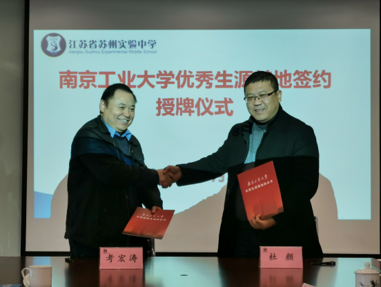 上午,在江苏省苏州实验中学举行了“优秀生源基地”签约挂牌仪式。江苏省苏州实验中学金山路校区执行校长杜颜、教务处主任马朱林、校长办公室主任张长松及高三年级主任丁宗国参加了仪式。杜颜校长对我校的到来表示欢迎,并介绍了学校的发展情况。下午,在苏州市吴江中学举行了“优秀生源基地”签约挂牌仪式。吴江中学校长张建华、副校长朱芸、卢卫忠、韩保席、徐峰及相关负责人参加了仪式。张建华校长代表吴江中学致欢迎辞,并介绍了学校的发展历史和建设目标。两场活动中,材科科学与工程学院党委副书记考宏涛代表学校与两校签署了“优秀生源基地”协议书。党委学生工作部黎能进对两校近年来向我校输送大量优质生源表示感谢,围绕“国内一流、国际知名、培养质量高、就业前景好、招生政策好”五个关键词介绍了我校的情况,并代表学校分别向两所中学授牌。