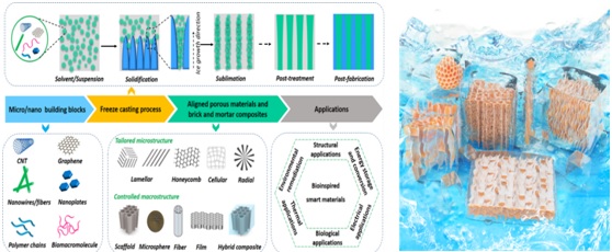 多尺度、多级次、各向异性多孔结构是生物系统的独特特征,师法自然,模仿此种结构的材料设计与合成已成为制备高性能结构和功能材料的一种有效策略。近年来,冷冻铸造法已被广泛用于微纳结构单元组装成三维有序多孔结构,是通向由自然灵感来设计材料到实现模仿在生物界中出现的功能性系统的桥梁之一。该方法具有灵活化的制备过程,多元化的材料体系,可剪裁的微观结构,可设计的宏观结构,以及多领域的应用前景等优势,因此备受科学界和工程界的青睐。沈晓冬教授联合南京信息工程大学邵高峰博士、德国柏林工业大学Aleksander Gurlo教授与Dorian A. H. Hanaor博士,在《Advanced Materials》发表了题为“Freeze Casting: From Low‐Dimensional Building Blocks to Aligned Porous Structures—A Review of Novel Materials, Methods, and Applications”(DOI:10.1002/adma.201907176)综述论文。该综述从冷冻铸造工艺的基本原理出发,介绍了冷冻铸造工艺的基本过程并阐述了各过程中的物理化学调控方法对材料微观结构的影响机制。总结了(1)新材料体系:以低维“积木”为构筑单元的三维有序多孔骨架;(2)新结构体系:通过结合其他成型技术获得的新几何结构;(3)新应用领域:三维有序多孔材料和“砖-泥”结构复合材料在结构、功能及智能材料领域的应用现状及前景。最后介绍了目前该领域存在的挑战和未来机遇。基于冷冻铸造法,团队在器件表面原位构筑了三维多孔石墨烯气凝胶材料,优化了气体传感器制作过程,实现了石墨烯气凝胶材料与传感器件制备合二为一,超低浓度NO2高响应循环稳定性好,极大地提高了石墨烯气凝胶的气体传感性能,相关工作发表在Chemical Communications 2020, 56(3): 450-453。