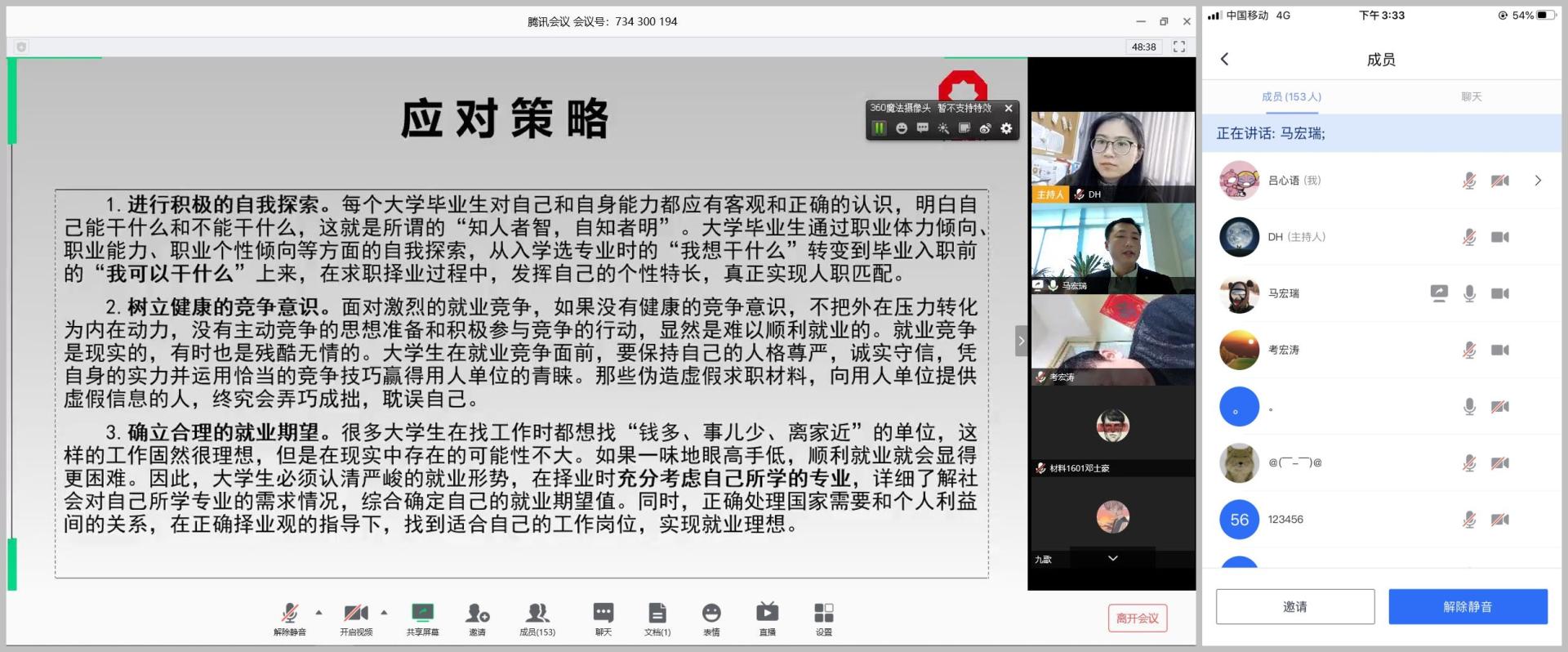 “抗疫情、保市场、强指导、优服务、稳就业”。为应对疫情对毕业生就业的影响,3月22日下午,由学生事务部主办、bv伟德国际1946承办的“网络求职择业实务指导”主题就业讲座通过腾讯会议顺利举办。中国建材集团合肥水泥研究设计院行政人事部主管、高级经济师马宏瑞应邀主讲。合肥院粉磨研究所总经理王虔虔、材料学院党委副书记考宏涛出席,近两百名毕业生参加,本次云讲座由院团委书记戴惠主持。