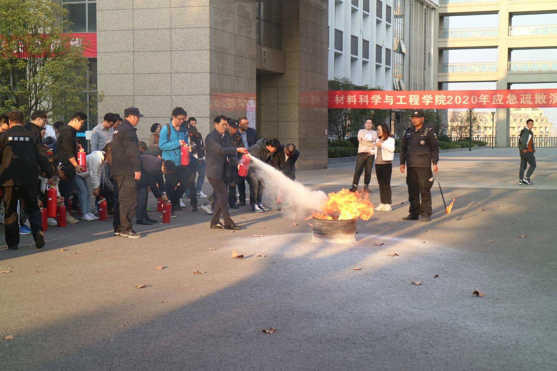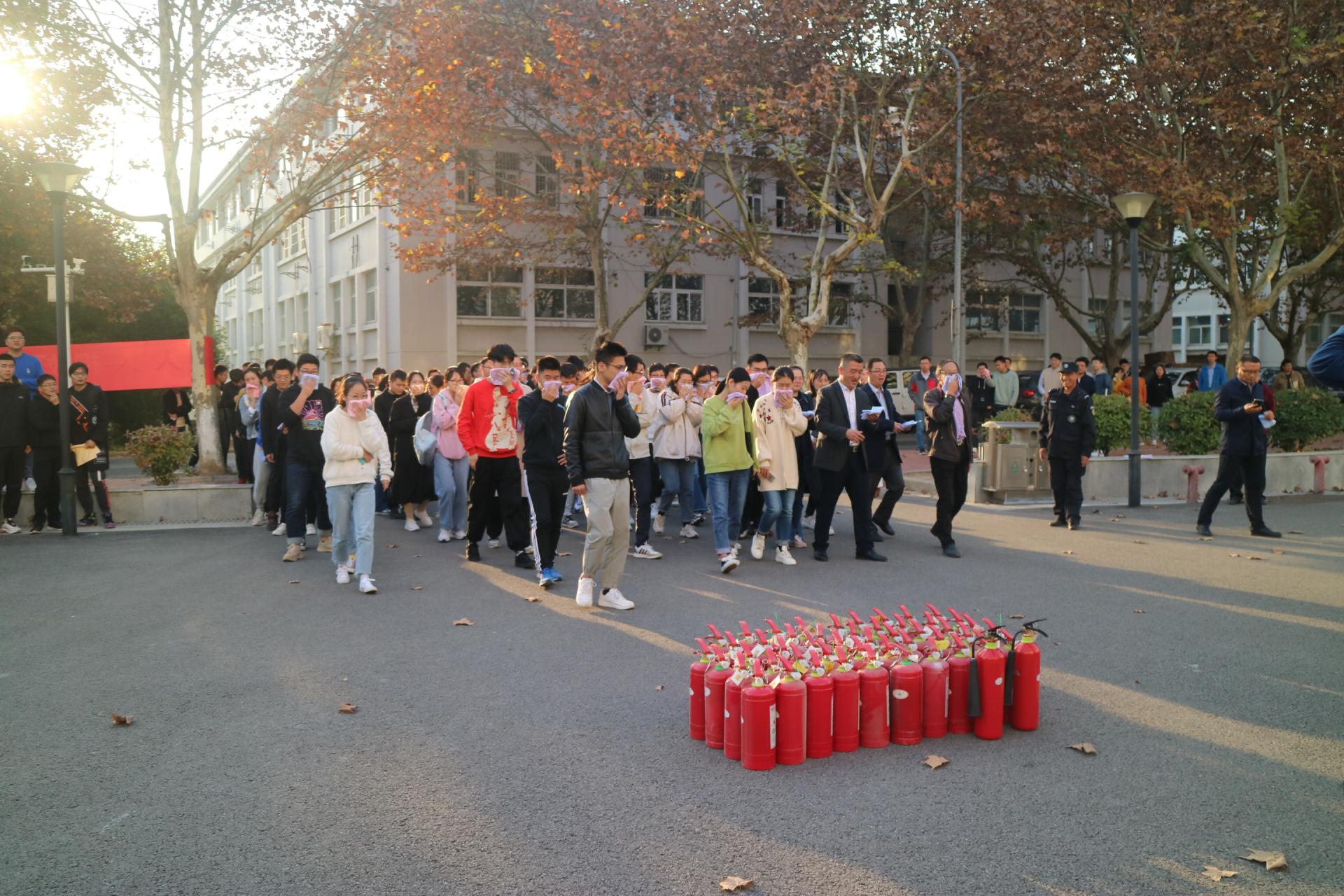 会议结束时,楼内消防警报拉响,进行了疏散演习,全院师生用毛巾捂鼻快速从楼梯有序下楼,疏散到学院楼前广场。随后,消防科施自力老师组织大家进行了消防知识有奖竞答,并就灭火器的正确使用方法进行了演示,在消防科老师的指导下学院师生分组进行了实际灭火演练。
