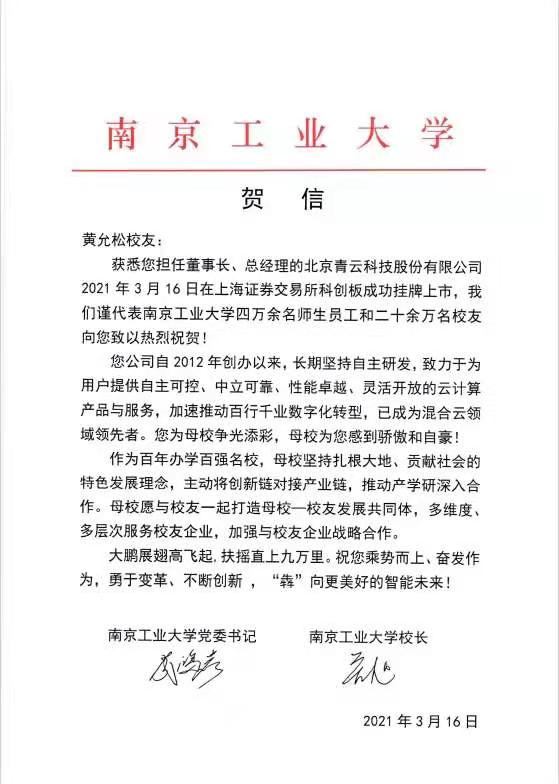 3月16日,校友企业北京青云科技股份有限公司(简称:青云科技)在上海证券交易所科创板挂牌上市(股票代码:688316),成为国内“混合云第一股”。公司董事长兼CEO为我院2000届无机非金属材料专业校友黄允松。校党委书记芮鸿岩、校长乔旭代表全体师生和校友,联名发去贺信,向黄允松校友致以诚挚的问候和热烈的祝贺。
