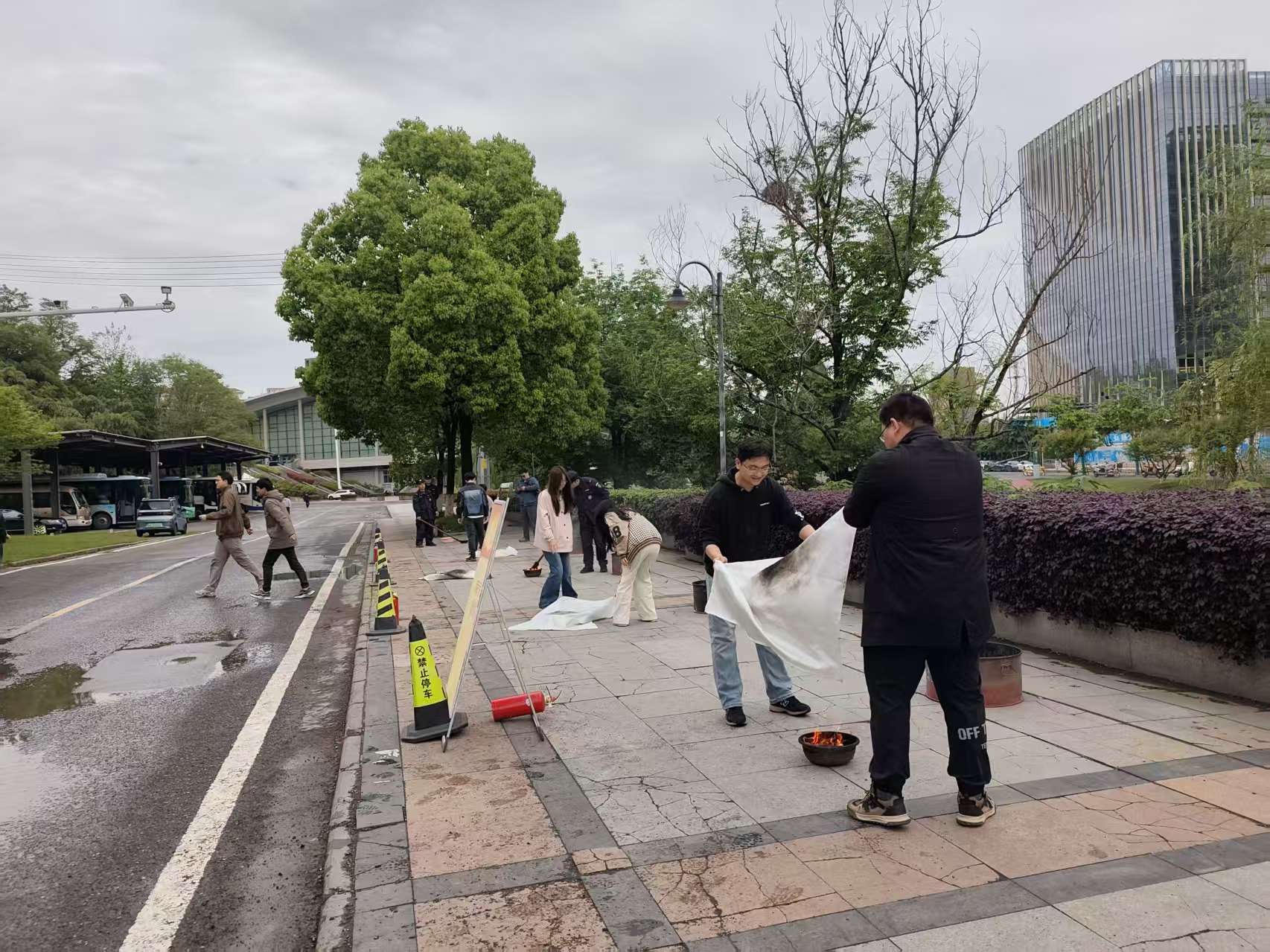演练现场划分多个实训区,由保卫处专业安全员全程驻点指导,带领学生在模拟火场中依次完成灭火毯与灭火器实操。安全员针对灭火距离不足、喷射角度偏差、风向判断失误等常见问题进行了及时纠偏。面对熊熊烈焰,学生们轮番上阵,亲身体验真实火场环境下的器材操作。“只有在真实火场中练过‘提拔握压’,才算真正掌握了扑救初起火灾的关键技能!”一位参与演练的学生感慨道。