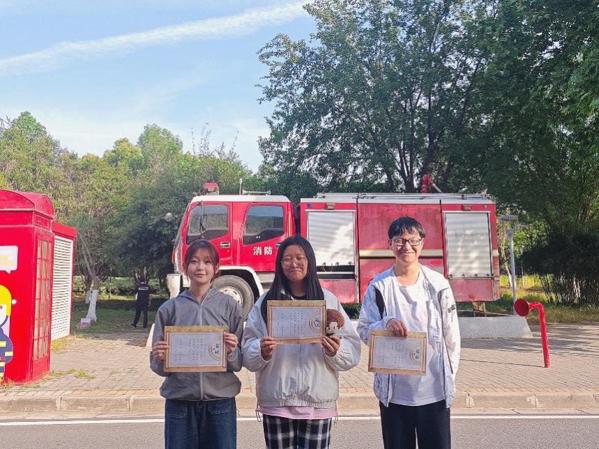在消防主题园区,同学们通过沉浸式观摩学习,系统了解火灾预防、应急逃生等知识。随后开展的"消防知识大闯关"将活动推向高潮,同学们举手抢答问题,将安全意识深植心间。经过激烈角逐,李妍等三位同学凭借扎实的知识储备脱颖而出,荣获"消防小卫士"称号。互动式学习让安全理念具象化,主题馆前的合影定格住青春洋溢的安全承诺。
