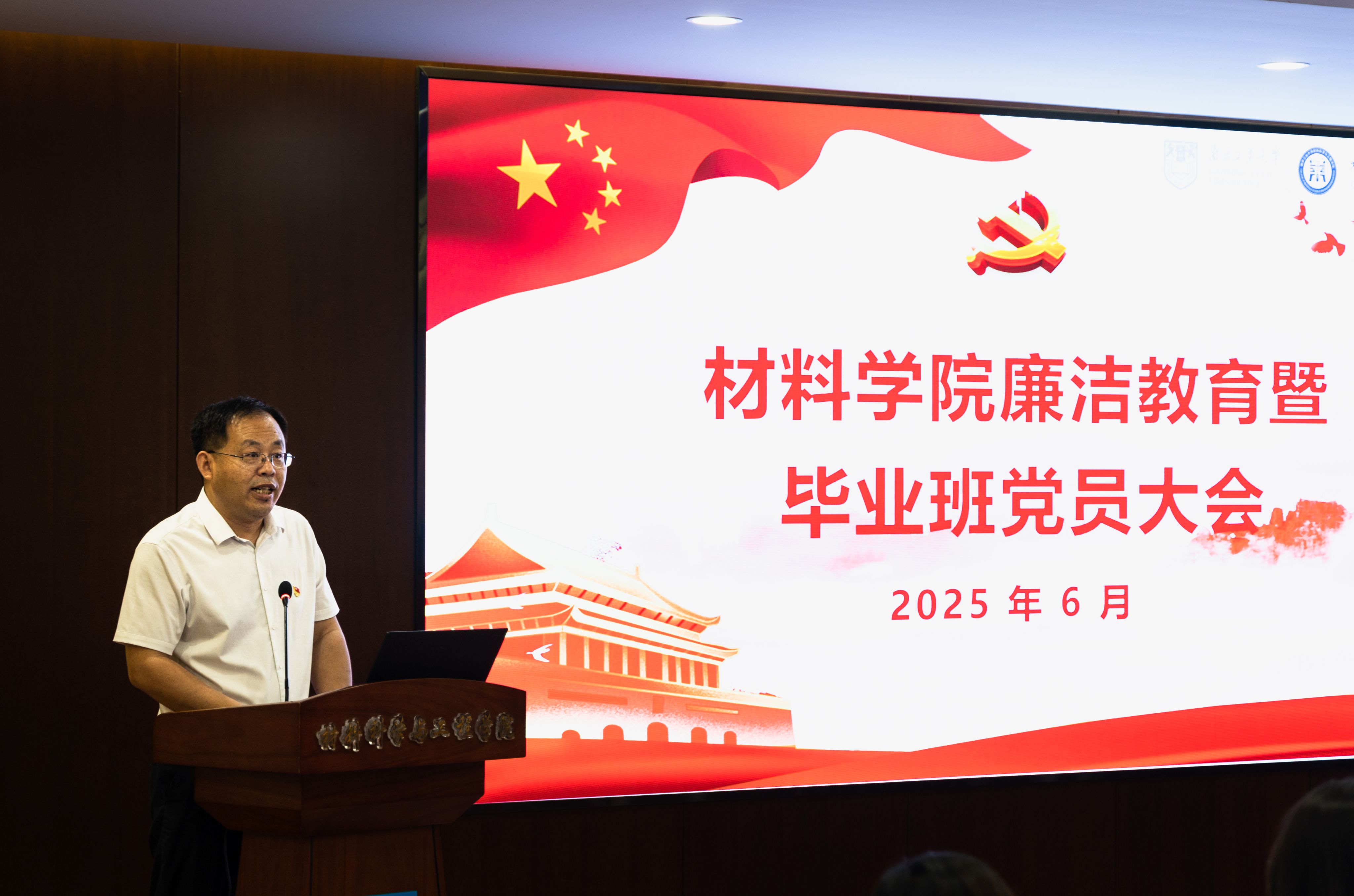 为进一步加强毕业生党员的党性教育和廉洁意识,更好地发挥党员先锋模范作用,6月6日上午,材料学院在润德楼B512报告厅召开廉洁教育暨2025届毕业生党员大会。学院党委书记高树军、组织员李炜程、毕业班辅导员、学生党支部书记及全体2025届毕业生党员参加。会议由学院党委副书记石防震主持。
