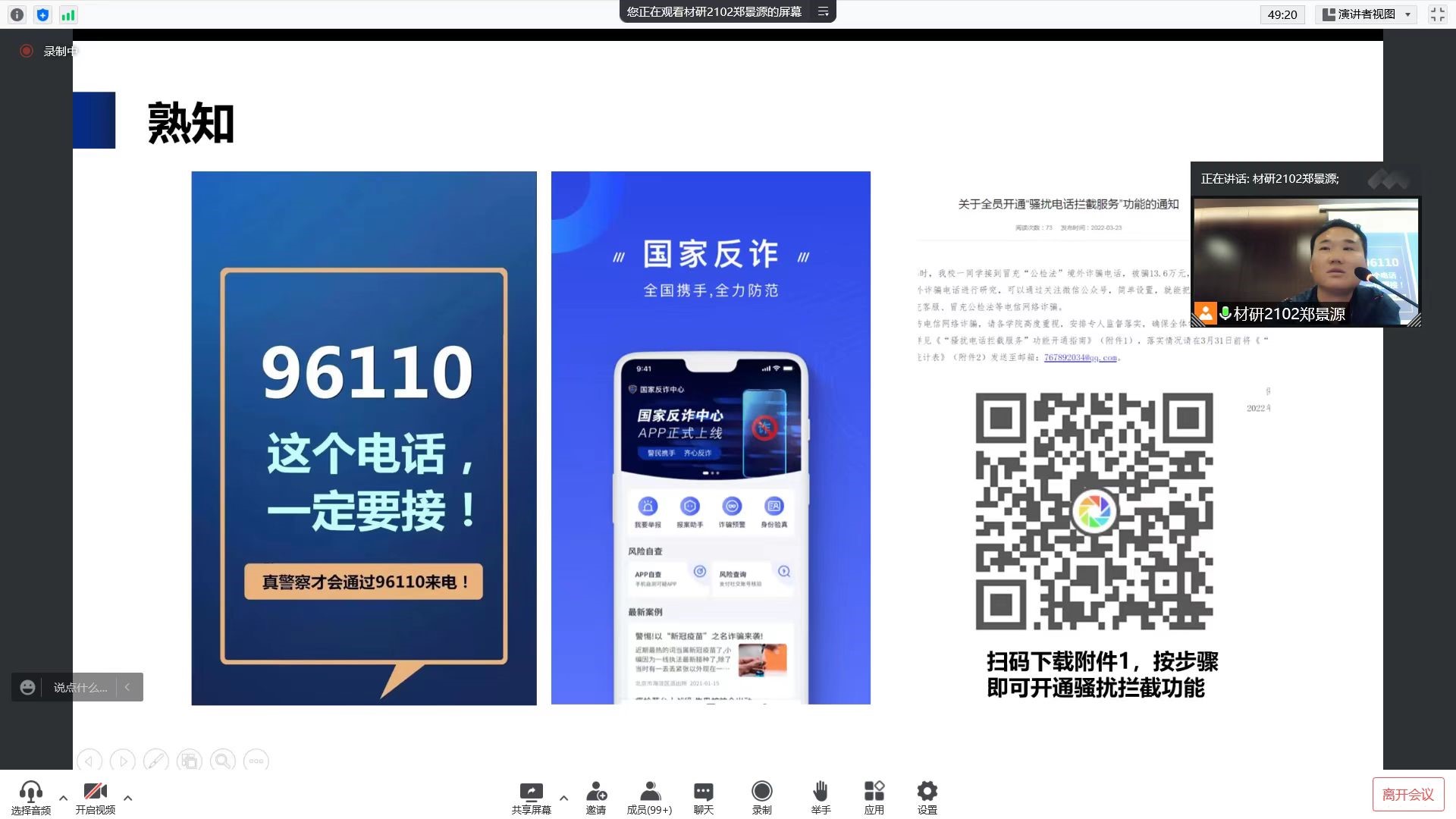 为迎接首届校研究生宿舍文化月的到来,提高同学们的防诈骗意识,5月11日下午,材料学院邀请伟德bv1946党委保卫部、保卫处葛凯老师为全院研究生带来了一场防诈骗知识专题讲座,分管院领导及辅导员参加了本次讲座,讲座采用线上线下相结合的方式开展。