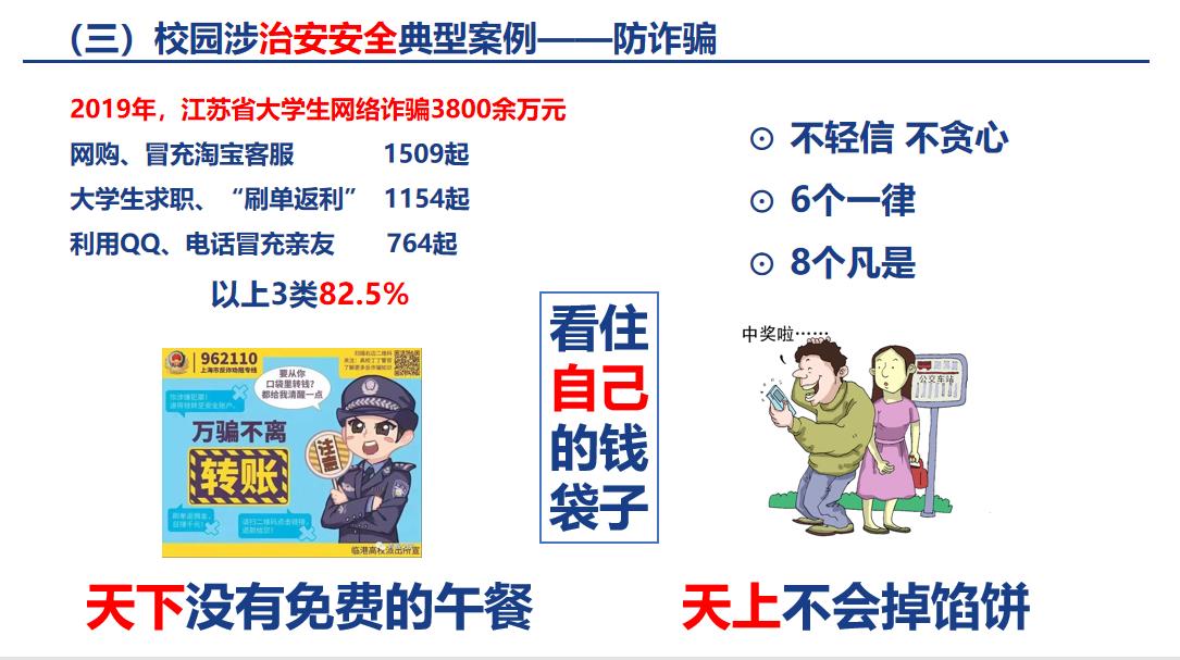 葛凯老师从校园政治安全、国家安全、治安安全、交通安全、网络安全、防电信诈骗等方面进行了详细讲解。他通过概念解析、网络舆论案例、网络诈骗种类、校园贷案例、外卖人员和学生骑行非机动车事故、学生宿舍突发火灾等实际情况,生动地向同学们阐述了校园安全的重要性。葛凯老师多次强调,要深刻认识到安全是一切工作的前提,希望同学们提高安全意识,珍爱生命。