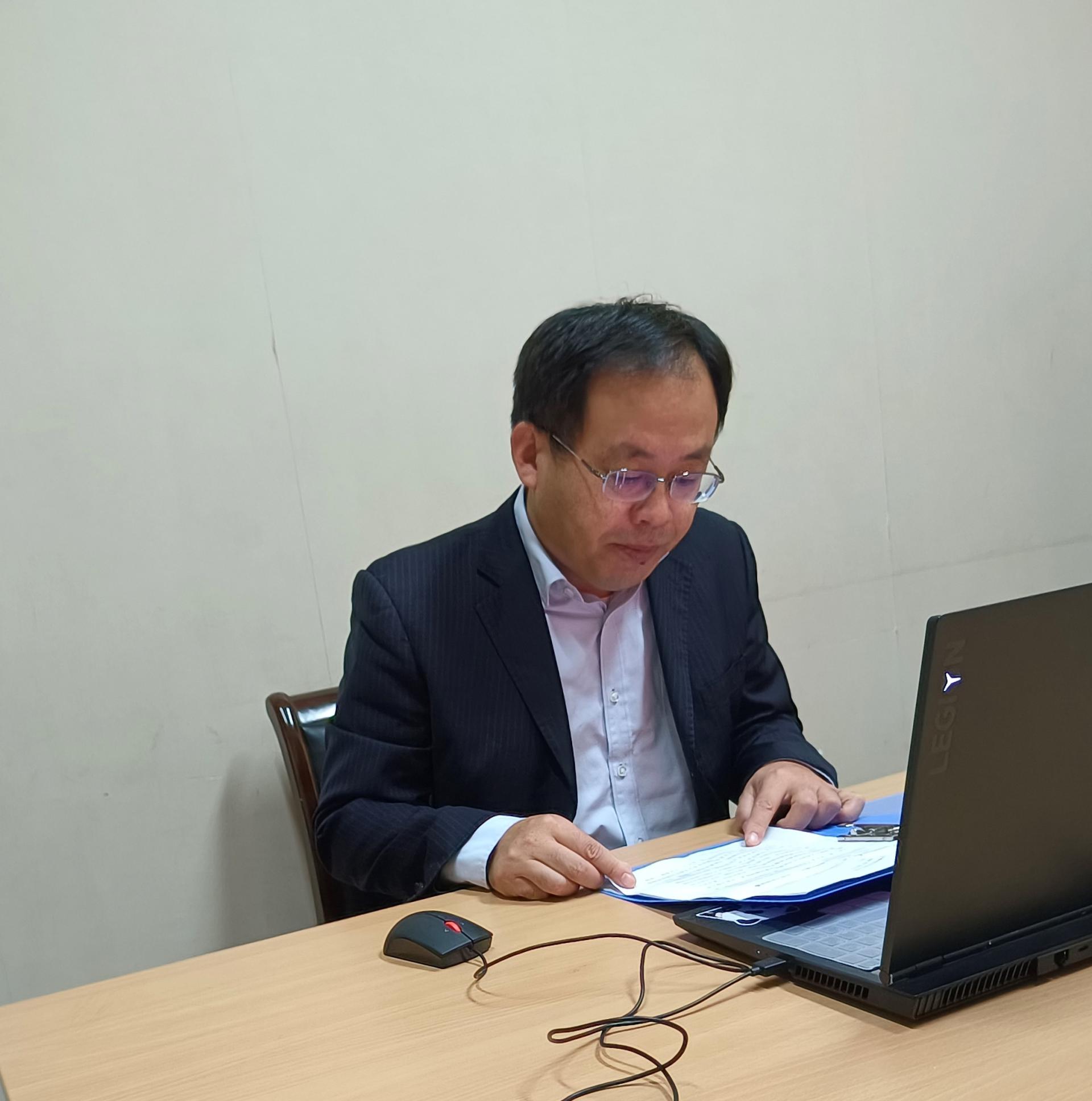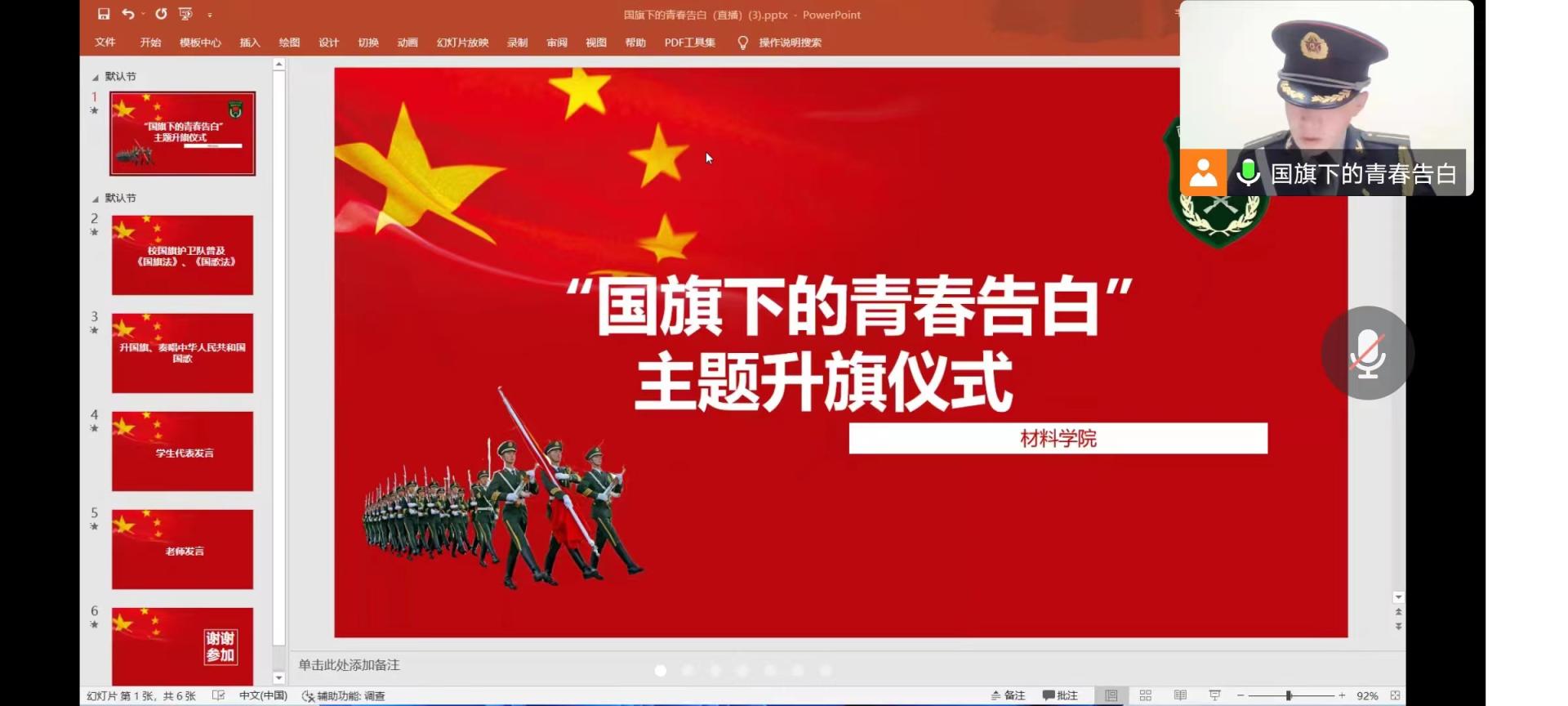 活动伊始,由国旗护卫队旗手普及国旗法、国歌法。紧接着,五星红旗在国旗护卫队的护送下缓缓移向国旗台。国旗在朝阳的照耀下冉冉升起,全体师生也通过在线直播观看了升旗仪式。材料学院材科英才2202班张仁杰同学作为学生代表发言,表达了他们对于祖国的热爱。学院党委副书记石防震老师发表了“厚植爱国主义情怀,争做新时代学生楷模”主题讲话。他带领同学们一起回顾了中华民族伟大的奋斗历程,阐述了以爱国主义为核心的民族精神的内涵。带领同学们一起学习习总书记对青年的希望和要求,号召广大学生从我做起要践行社会主义核心价值观,锤炼品质、升华自我。