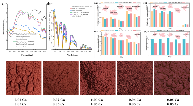 bv伟德国际1946学院崔升教授、张垠教授团队在红色冷颜料领域取得突破性进展。该团队以钙钛矿结构LaAlO3为基体,通过Ca2+和Cr3+离子掺杂调控钙钛矿结构中的A位和B位元素,成功合成了La1-xCaxAl1-yCryO3体系高近红外反射红色冷颜料。通过精确控制Ca2+/Cr3+的比例,实现了高NIR反射性能和鲜艳红色颜料,同时抑制了Cr6+的形成,提高了材料的环境友好性。该颜料在700-2500 nm波段的近红外反射率高达77.61%,在模拟太阳照射下,颜料涂层较传统铁红涂层降低表面温度5 - 6℃,呈现出卓越的隔热性能。EnergyPlus模拟结果显示,该颜料涂层可使南方典型城市建筑年冷却能耗降低19-21%。该材料具有原料易得、工艺简便、性能卓越和成本低等优势,在绿色建筑涂层及户外节能领域具有出良好应用前景。