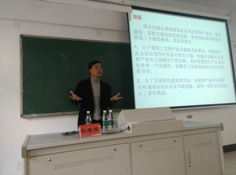 下午两点半,讲座开始。孙维理先生首先向我们介绍了关于新型建材的一些基本概念。为响应国务院关于建筑产业化,建筑节能的导向,优秀的新型建筑材料必须符合以下五个标准:1、遵循个性化定制,机械化装配,产业大规模生产的基本原则。2、实现绿色建筑的目标。3、保持机械化,设备化。4、实现物流运输产业化(特别是销往国外的产品)。5、适应建筑设计,施工工艺的改变,继而实现建材制造工艺的改变。孙维理先生介绍到,继十三五以来,国家对建材设计方面的节能减排要求显著提高,新型建材设计工艺也随之发生改变。之后,孙维理先生向我们介绍了关于南京旭建新型建材有限公司的一些成绩,其生产的加气混凝土等新型建材因生产规范,质量轻,强度高,质量好,被应用于南京奥林匹克中心场馆建筑群,苏州工业园区置业广场以及海内海外等诸多建筑,并在实践中的到充分的检验。此外,由南京旭建新型建材有限公司生产的产品,获得了包括全国,江苏多项绿色建筑奖,并获得许多国际检测机构的认证。最后,孙维理先生向我们总结了关于材料如何更好的适应工程实践的问题:应用于实际的材料要考虑材料的性能,制造工艺,成本等等,若想更好地适应于工程,就应当适应市场的结构,适应建筑设计,施工工艺的改变并作出相应的改变。讲座结束,材料学院副院长常辉教授向孙维理颁发了创新创业导师聘书。