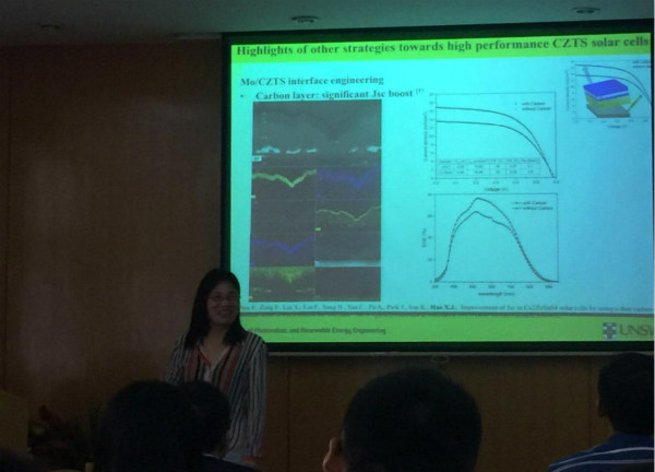 Dr. Xiaojing Hao首先介绍了澳大利亚新南威尔士大学的位置环境、学术氛围及学术影响力,尤其是在太阳能电池研究和商业化方面的世界领先地位;随后详细分析了太阳能电池的发展历程和目前国际上的研究现状,最后重点介绍了她领导的团队在新一代廉价、无毒、柔性Cu2ZnSnS4 (CZTS)太阳能电池领域的开创性工作和取得的一系列重大突破。Dr. Xiaojing Hao的团队目前保持着CZTS太阳能电池光电转化率9.7%的世界纪录,她的报告展示了CZTS太阳能电池良好的发展前景。 此次报告内容丰富、生动精彩,Dr. Xiaojing Hao的讲授和蔼可亲、深入浅出,赢得了在场师生的热烈掌声。报告最后,Dr. Xiaojing Hao就报告内容与在场的师生进行了互动交流,对提出的问题给予了深入的解答,也表达了与我院在科学研究和人才培养、交流方面开展合作的美好愿望。此次报告会拓宽了师生的知识面,使得师生们对新型太阳能电池材料有了更加全面、深入的认识。